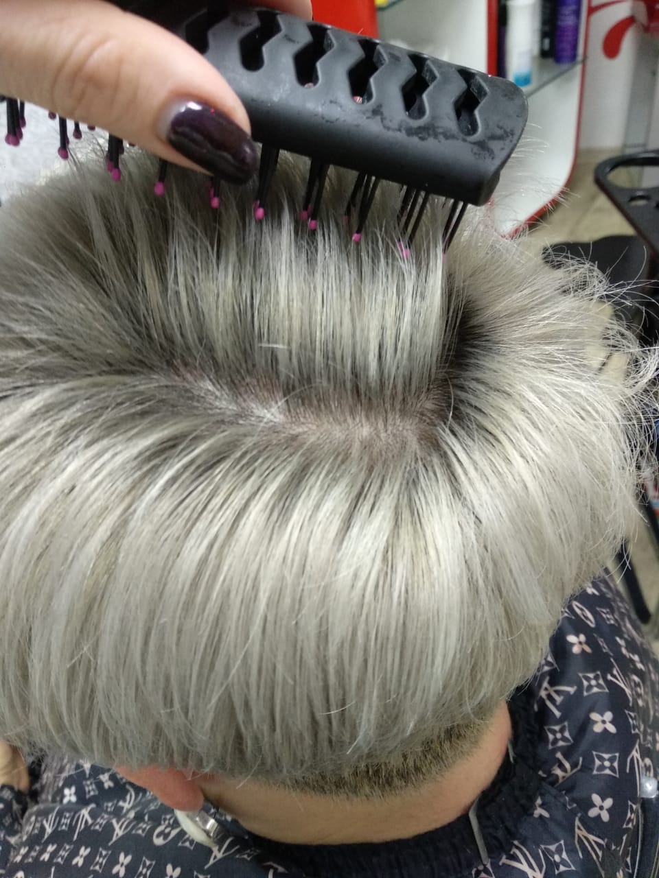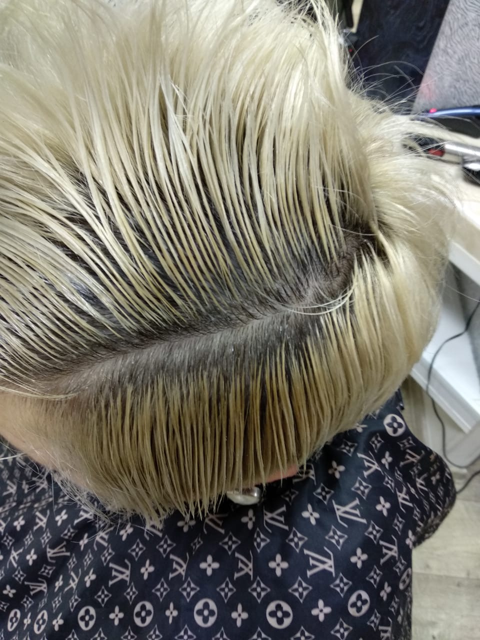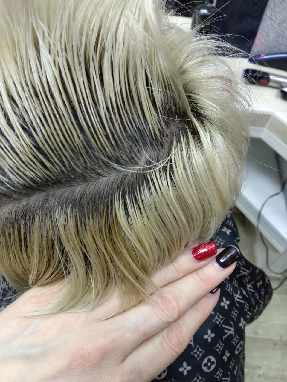 Теперь посмотрим на работу тонера в деле (использован стальной оттенок). Спустя 20 минут после нанесения - ровный, чистый, плотный ледяной оттенок блонда без намека на желтизну.
