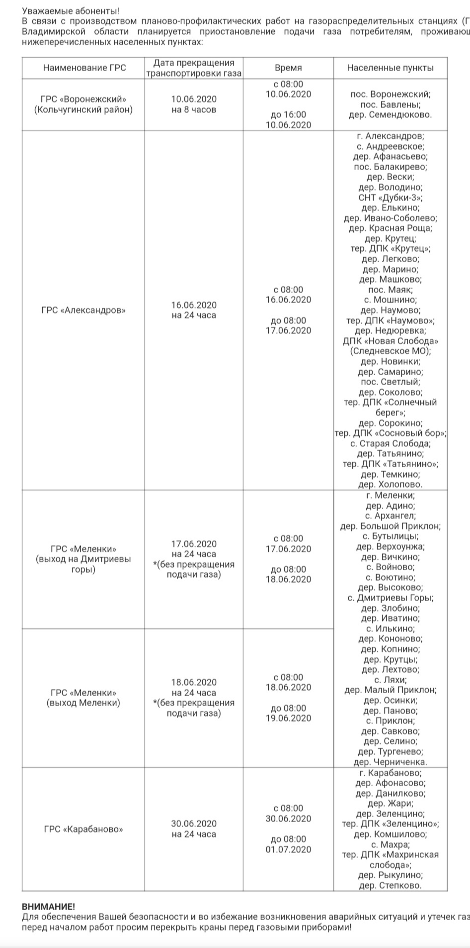Информация об отключении газа на ГРС Александров и ГРС Карабаново в июне 2020 г.