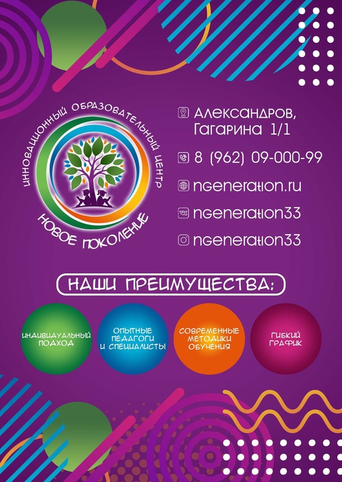 Получить более подробную информацию о нашем ЦЕНТРЕ и его услугах, Вы можете по телефону или через ВК https://vk.com/ngeneration33, задав вопросы администраторам группы.