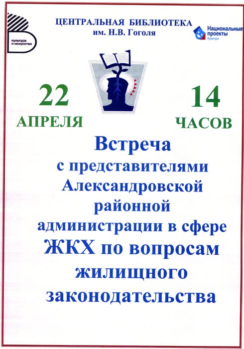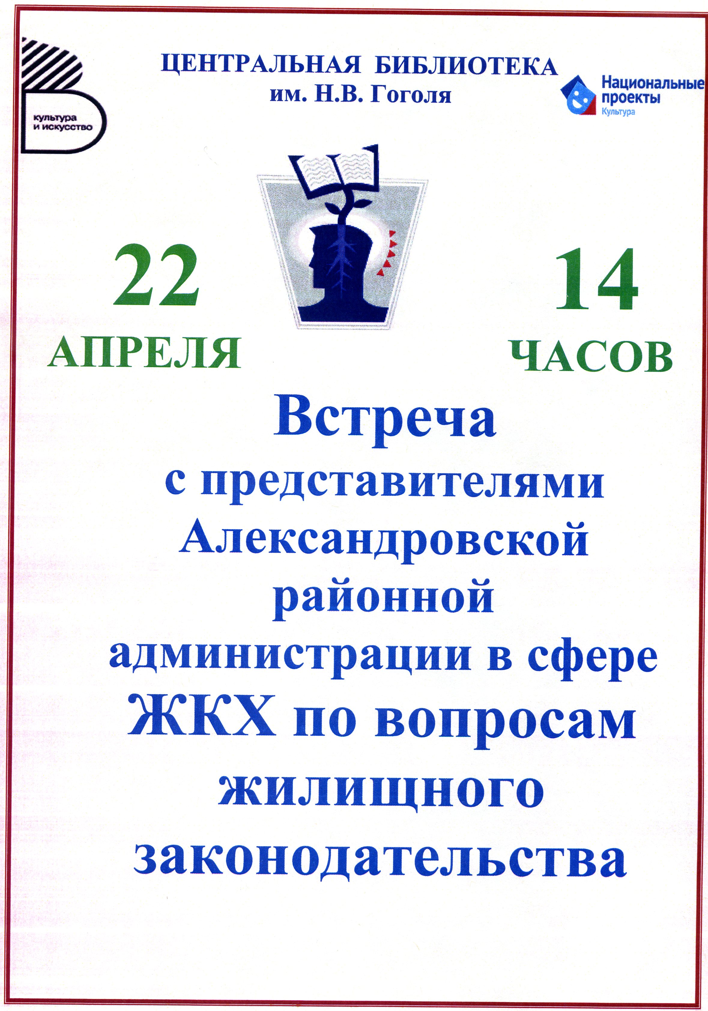 22 апреля в 14:00 в Центральной библиотеке им. Н.В. Гоголя состоится встреча с представителем Александровской районной администрации в сфере ЖКХ по вопросам жилищного законодательства
