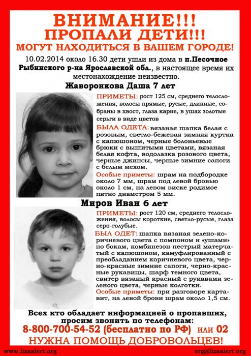 10 февраля 2014 года в поселке Песочное Ярославской области пропали два ребенка: Жаворонкова Даша 7 лет и Миров Ваня 6 лет. В связи с этим поисковый отряд "Лиза Алерт" объявляет масштабное оповещение по всей стране о пропавших детях.