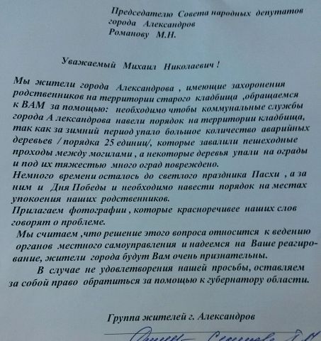 спилили и на оградку положили, россия, типа за спил оплатили, а убирать не договаривались....во прос к знающим людям: а почему письмо адресованно Романову? а не совету? или он их последняя надежда? просто как я понимаю фото сделано депутатом? может я конечно не прав...