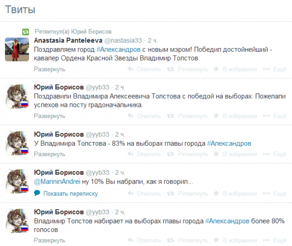 На досрочных выборах главы города Александров по состоянию на 00 часов 55 минут 19 мая 2014 года обработано 100% протоколов участковых избирательных комиссий, явка составила 10,83 %.