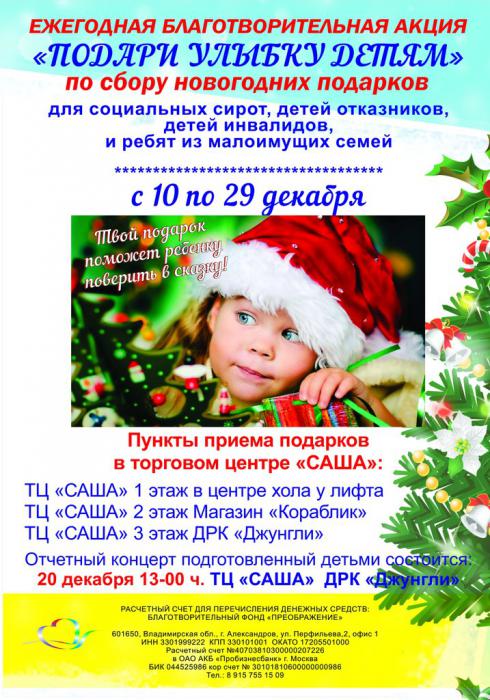 Благотворительный Фонд «Преображение» проводит Акцию по сбору новогодних подарков для детей, оказавшихся в трудной жизненной ситуации (социальных сирот, детей отказников, детей инвалидов). Вспомните, как все мы в детстве ждали этот праздник и заглядывая под елку с восторгом и счастьем обнаруживали там то, о чем мечтали и писали в письме Деду Морозу!