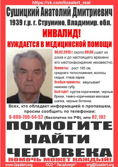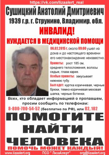 Внимание! Пропал Сушицкий Анатолий Дмитриевич 1939 г.р. ИНВАЛИД, НУЖДАЕТСЯ В МЕДИЦИНСКОЙ ПОМОЩИ! 06 февраля 2015 года около 9,00 вышел из дома в г. Струнино Владимирской обл. С тех пор его местонахождение неизвестно.