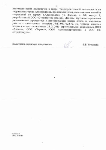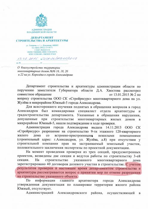 В начале темы были только слова о нарушении законности строительства жилого дома, но это были только слова. Теперь тема получила свое развитие и по фактам нарушений были проведены проверки надзорными органами. Результат проверок меня лично совсем не удивил. Вот одно из официальных писем с результатами: