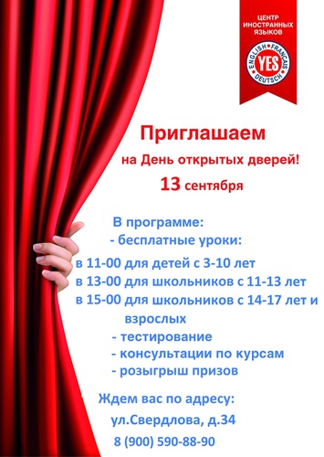 13 сентября Центр иностранных языков "YES" приглашает на ДЕНЬ ОТКРЫТЫХ ДВЕРЕЙ!