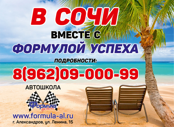 Дорогие друзья! 28 августа Автошкола "Формула Успеха" разыграет свой ГЛАВНЫЙ ПРИЗ, поездка в СОЧИ на неделю на двоих! И не только его, у нас в гостях будут друзья и партнеры Автошколы,которые придут на праздник не с пустыми руками! Надеемся , что погода не подведет, ведь мы планируем послушать еще и отличную "живую" музыку. Мы приглашаем всех желающих принять участие в празднике! И не забывайте, что у каждого из вас есть возможность выиграть призы от наших друзей и партнеров и Суперприз "Неделя в Сочи"! Звоните ! Наш телефон 8 962 09 000 99. Автошкола "Формула успеха".