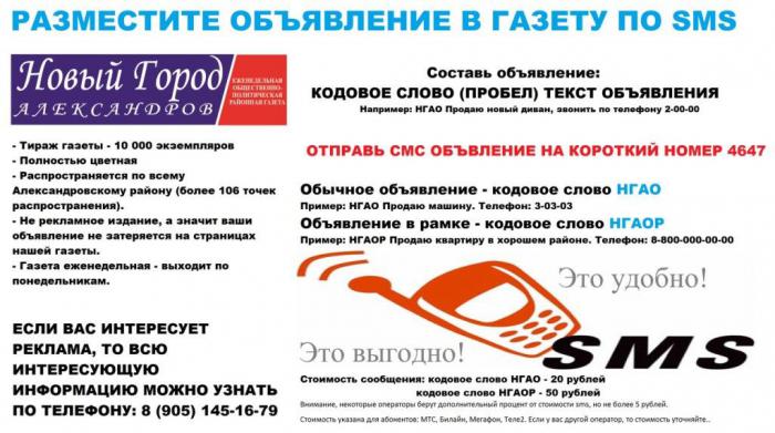 Подать объявление в газету "Новый город Александров" стало проще. Теперь не выходя из дома или офиса с помощью смс на короткий номер можно разместить свое объявление в ближайшем выпуске газеты.