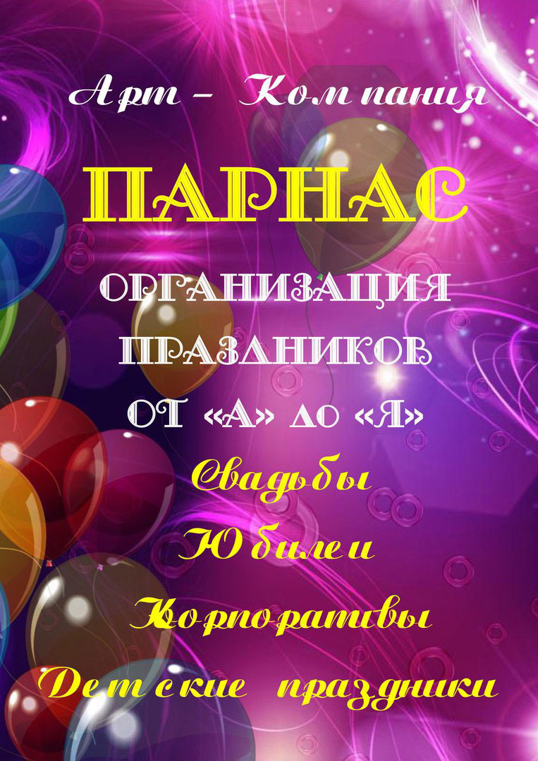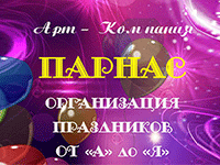 Арт-компания "Парнас" предоставляет услуги по организации и проведению любых культурно-массовых и развлекательных мероприятий на профессиональном уровне: свадьбы, юбилеи, корпоративы, детские праздники, выпускные вечера и многое другое. Доверив организацию Вашего праздника нам, Вы можете быть уверены, что он будет ярким, радостным и неординарным! Мы берёмся за самые интересные нестандартные творческие проекты с образовательным, развлекательным, творческим наполнением и выполняем работу с душой! Мы всегда открыты к интересному сотрудничеству, благотворительности, новым идеям!