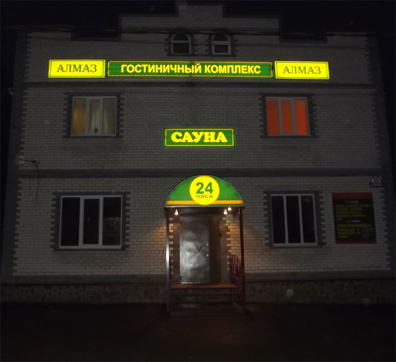 В тихом и уютном уголке г. Струнино радушно распахивает свои двери гостинично-развлекательный комплекс «Алмаз» и приглашает Вас отдохнуть от рабочей суеты и от домашних хлопот! Наша гостиница располагает 9 уютными номерами, отличающихся по цене и уровню комфорта (номера одноместные, двухместные, люкс, семейный номер и номер для новобрачных). Все номера в современном стиле, комфортные, с красивым дизайном, обставлены современной мебелью. Проживание в нашей гостинице 24 часа в сутки (без расчётного часа)! Также всегда к Вашим услугам: сауна, бассейн с подсветкой, банкетный зал на 20 человек, русский бильярд, романтичная комната отдыха, душ с современной сантехникой, а для любителей кальяна - восточная комната, которая превзойдет все Ваши ожидания, там Вы сможете насладиться настоящим ароматом кальяна, восточными танцами на DVD, угоститься настоящим восточным чаем, поиграть в нарды и просто душевно отдохнуть. Все комнаты оборудованы TV. Бар при комплексе работает круглосуточно, так же для Вашего удобства - доставка горячей пищи с пылу жару к Вашему столу!